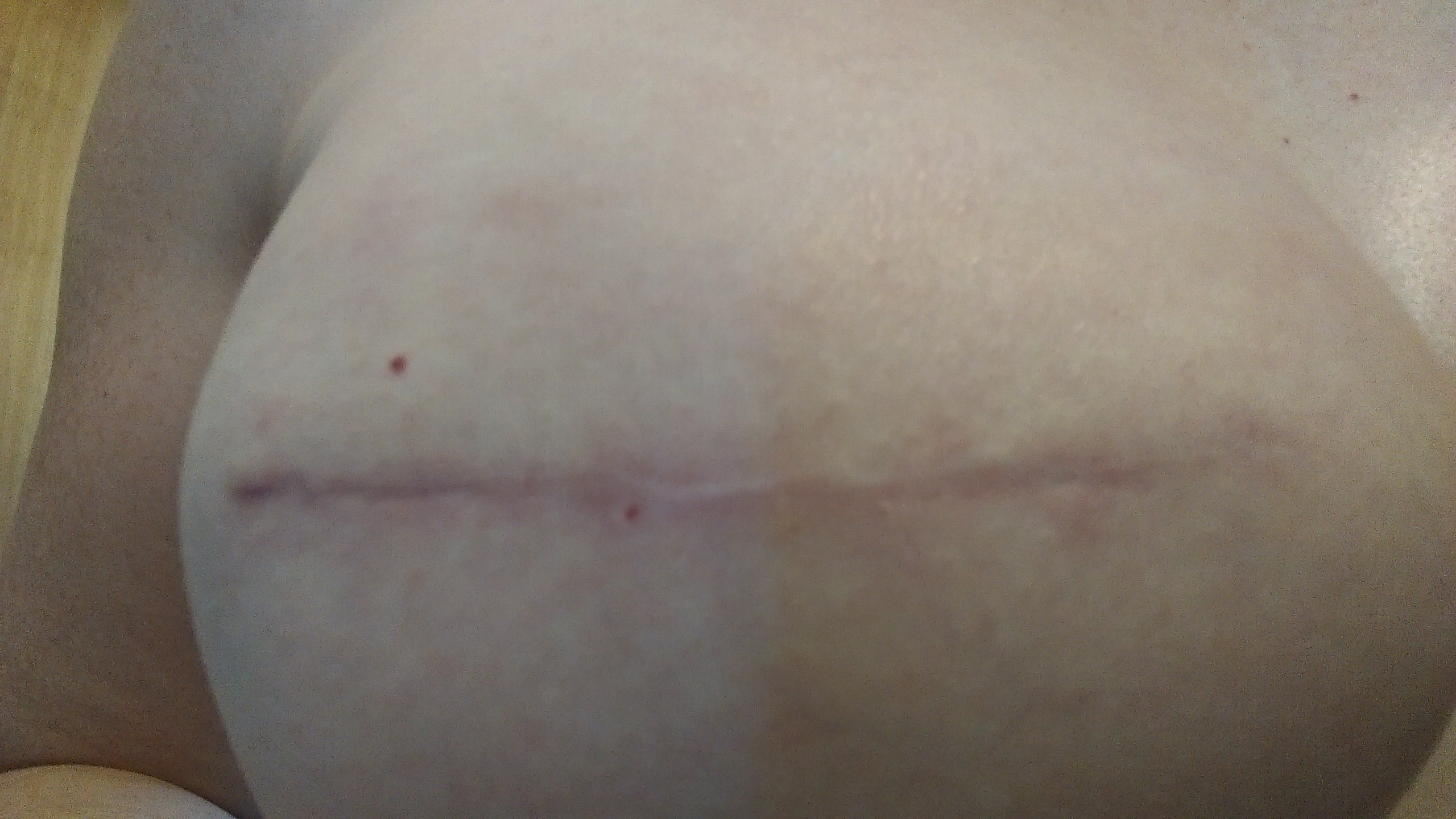 I was a little unsure a month ago, but I took some photos and they changed my mind.  I see myself every morning, I look okay, I don’t look like a topless model. I’ve got used to Barbie boobs, the unevenness, the crease on my right side and an indent where the surgeon scraped close to the skin where my cancer was. I don’t like the corners at the ends of the scar seams, but I believe they will probably smooth out over time. If not I think they look worse when I look down on them.  I’ve posted some bad phone images below, leave now if you’re weirded out by scars and deformities. They’re not gross, just a little unusual.
